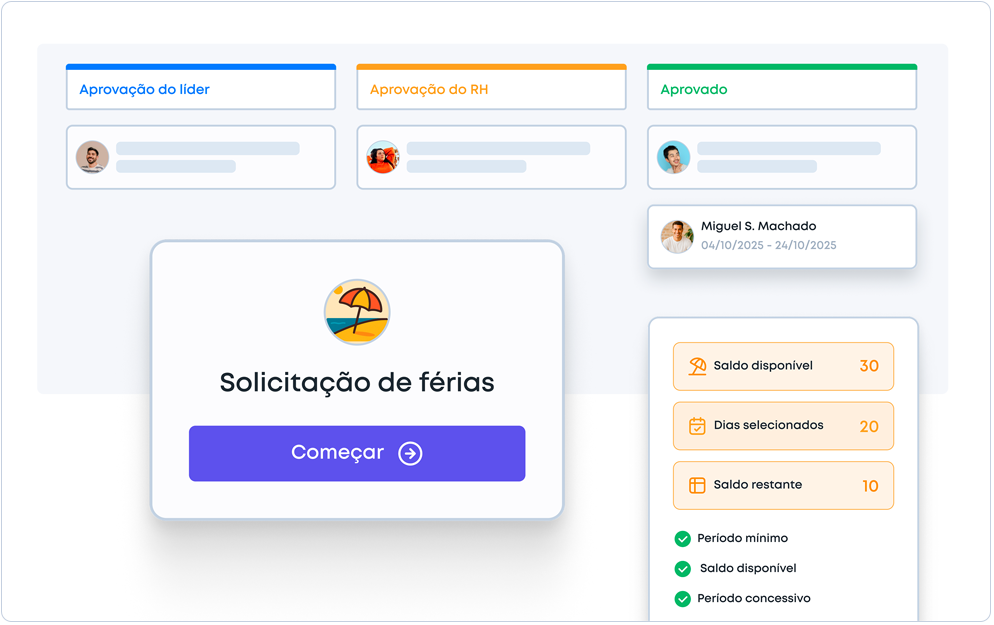 Organização dos fluxos de solicitação e aprovação das férias, respeitando as regras da CLT e/ou outras regras definidas pela própria empresa.