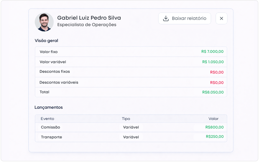 Consolide automaticamente os eventos fixos e variáveis da remuneração dos PJs e gere relatórios de pagamento detalhados para o time.
